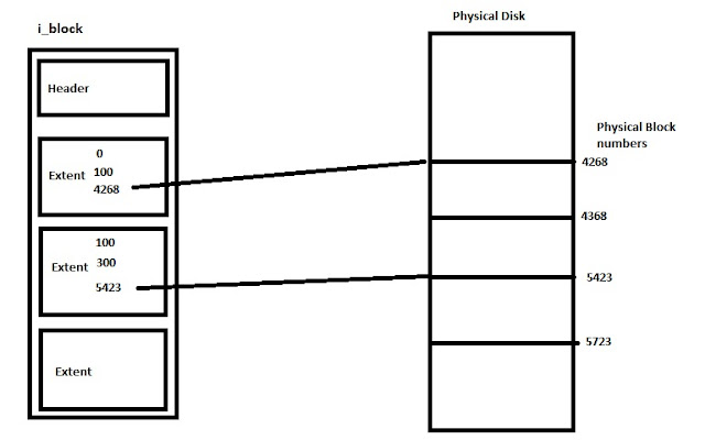 The Extent is implemented as a B+ Tree. Only the leaf nodes has the Extent Structure. Others have Extent Index Structure. The extent information starts with the header and then either Extent or Extent Index.In the i_data there is only space for header and 3 more Extent structures. If more extent information needs to be stored, than whole bocks with extent index structures are used. In the non leaf nodes, extent index structures are used. It contains the block number of the block where next level of nodes are stored.